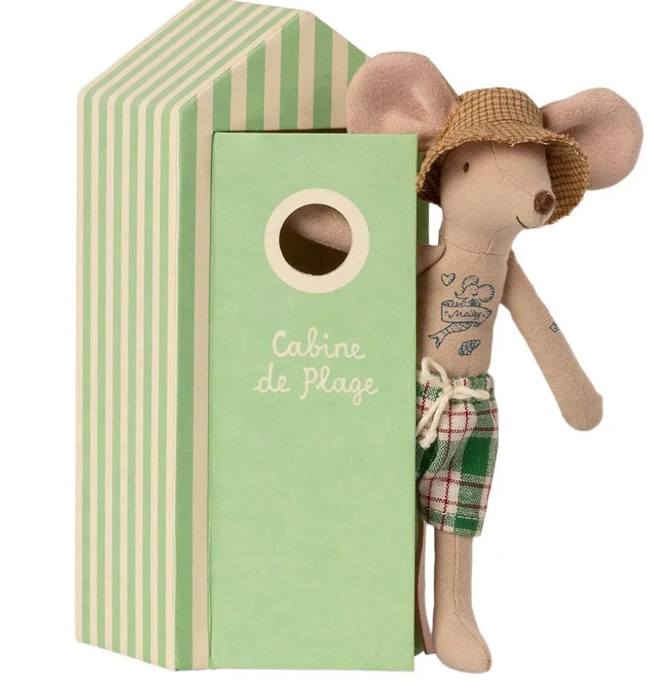 Vader muis draagt een hoed en zwembroek en je krijgt hem in het badhokje.