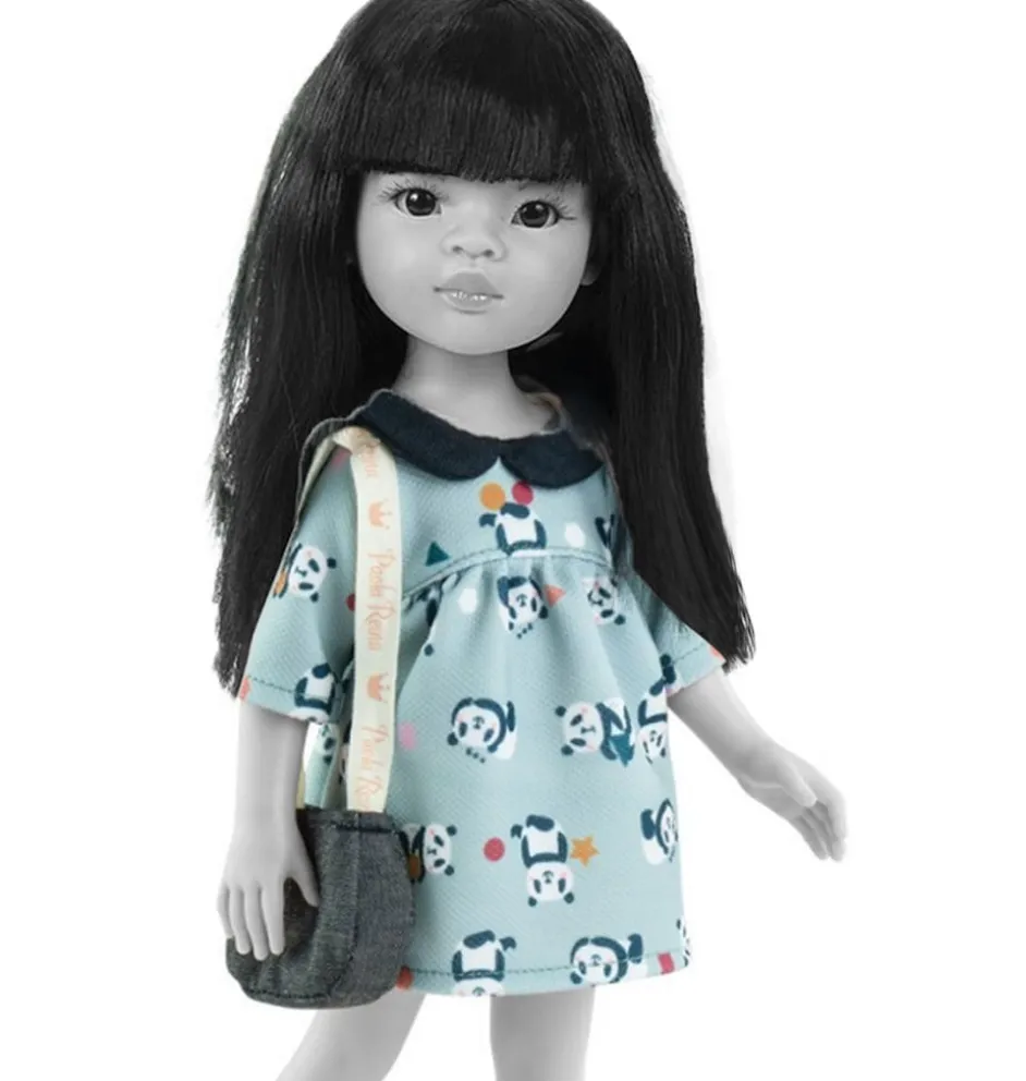 Dit setje bestaat uit een jurkje met pandaprint, een denim look schoudertas, sokjes en een onderbroekje.