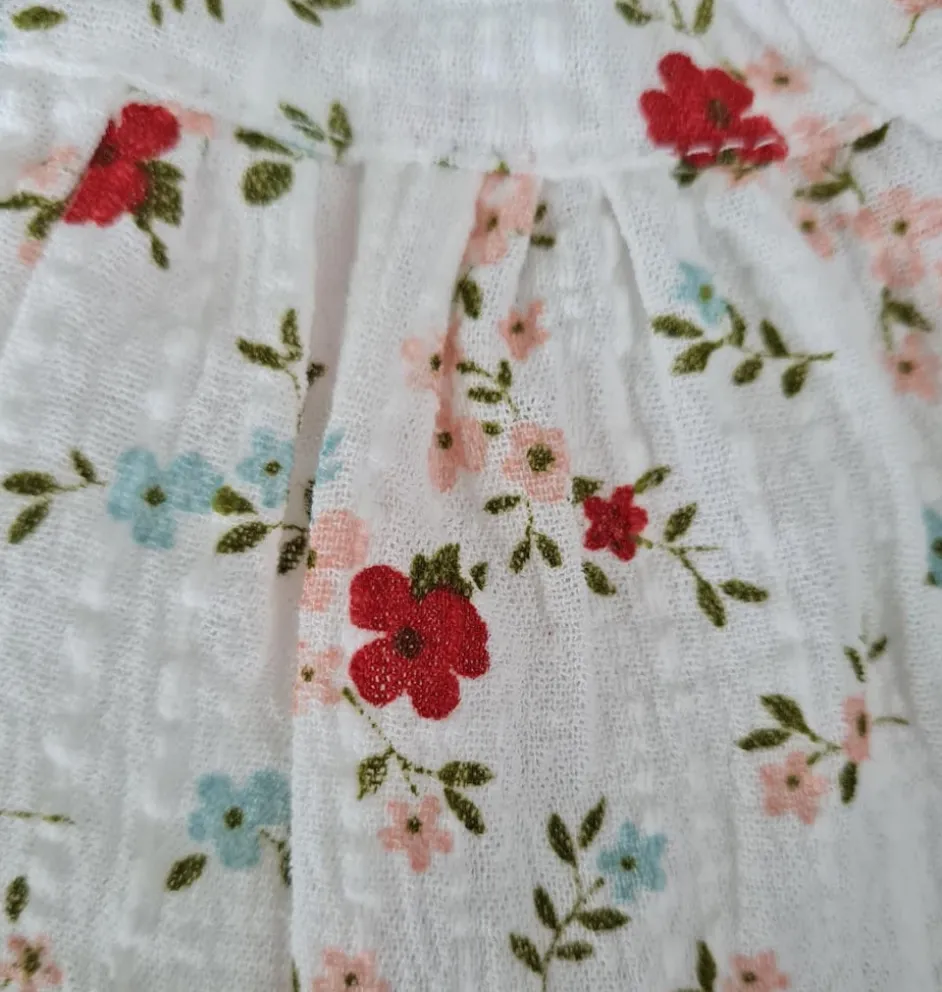 De bloemenprint heeft iets andere kleuren dan op de foto. De kleuren komen overeen met de tweede foto.