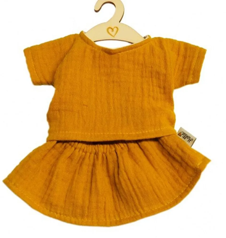 Kledingset voor jouw Gordi pop. De set bestaat uit een okergele top en rok.