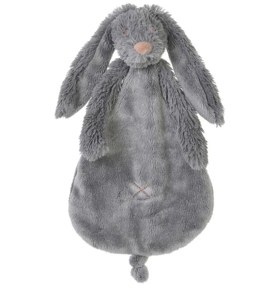 Zacht knuffeldoekje in de vorm van een grijs knuffelkonijntje. Gemaakt door Happy Horse. Zeer geschikt als kraamcadeautje. Het doekje is wasbaar op 30 graden. Het knuffeldoekje is 25 cm