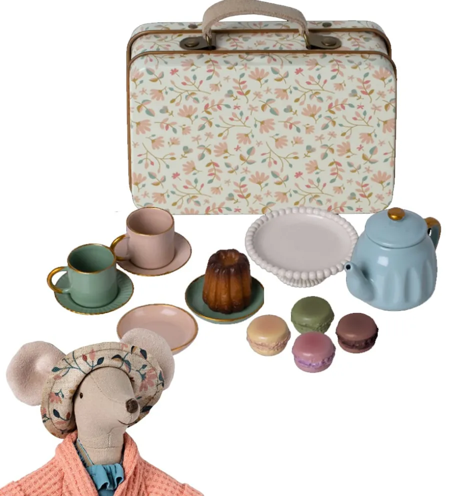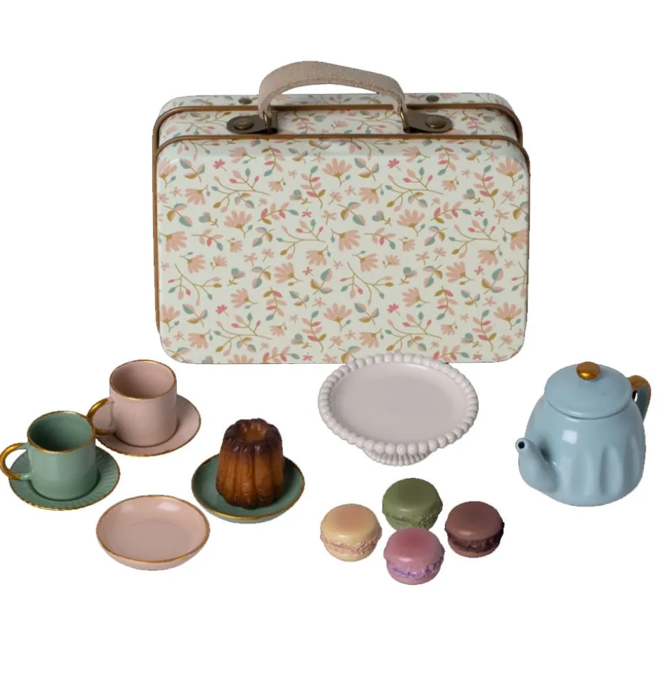 Superleuk van Maileg is dit metalen koffertje, met theekopjes, een theepot, macarons en een taartje.