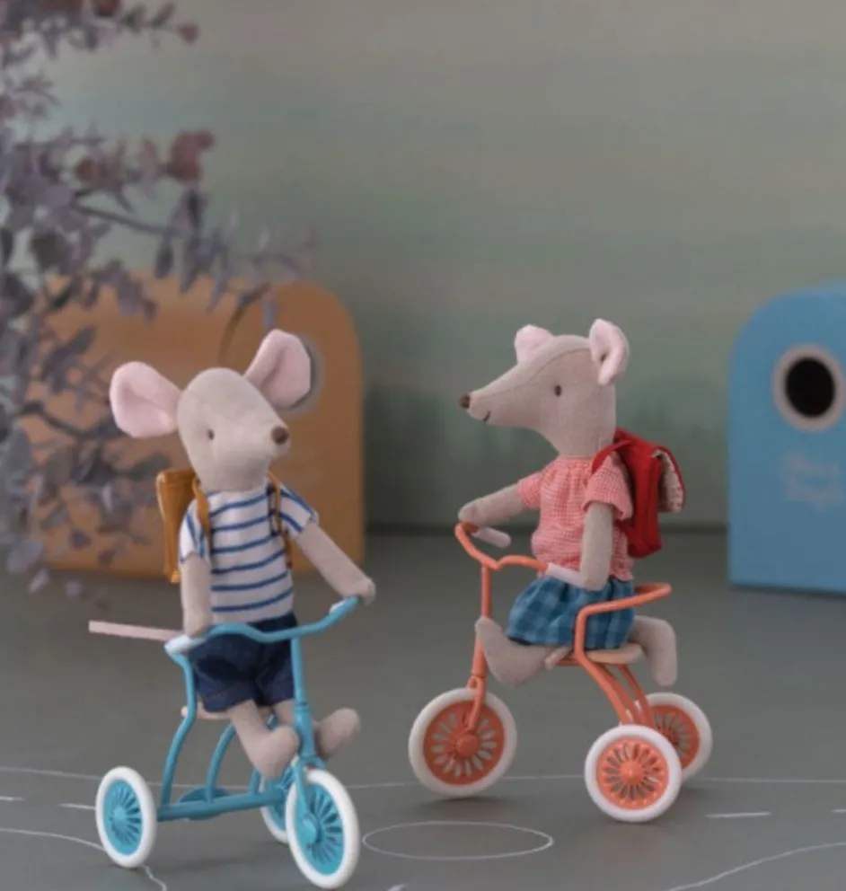 Dit Maileg muisje heeft magneetjes in haar handjes zodat zij het fietsstuur kan vasthouden.