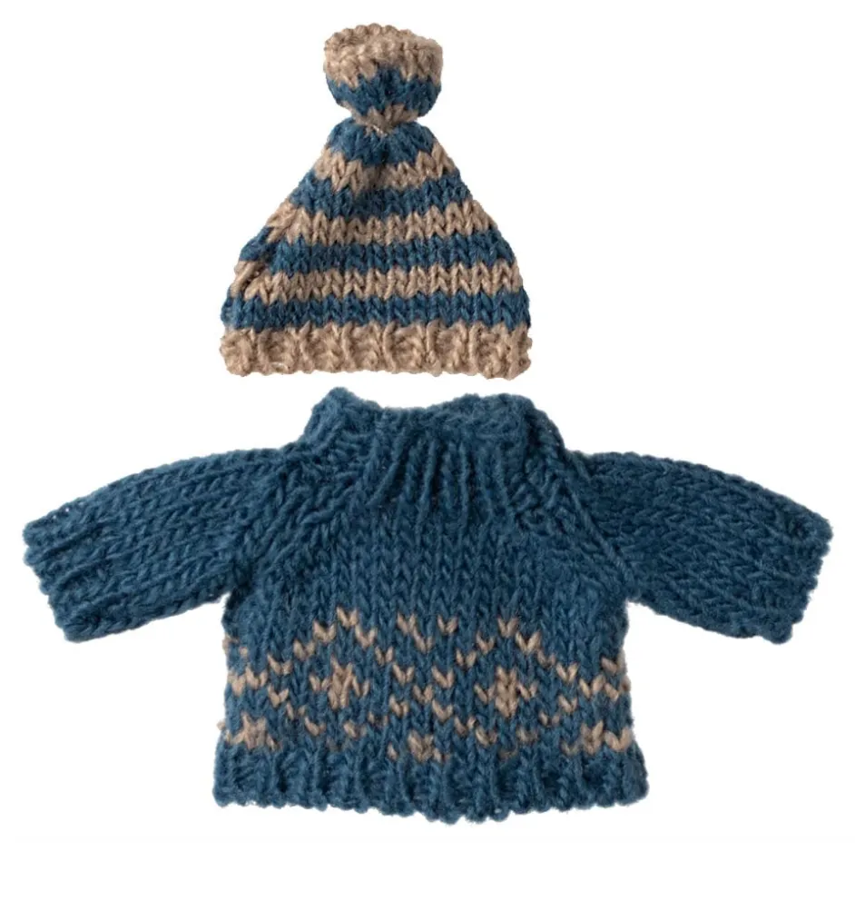Gebreide trui en muts van het Deense merk Maileg, perfect voor de winter! Deze set is speciaal ontworpen voor de Maileg vader muis, maar opa, oma en moeder muis passen de kleding ook.