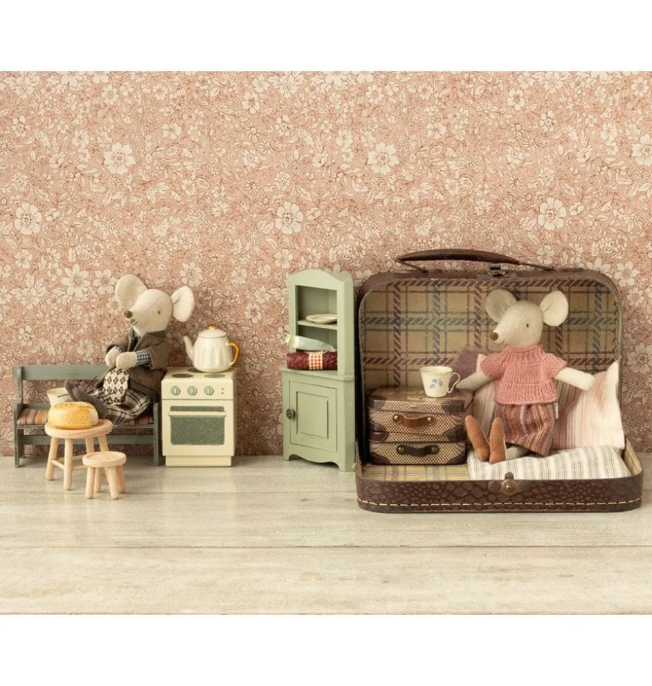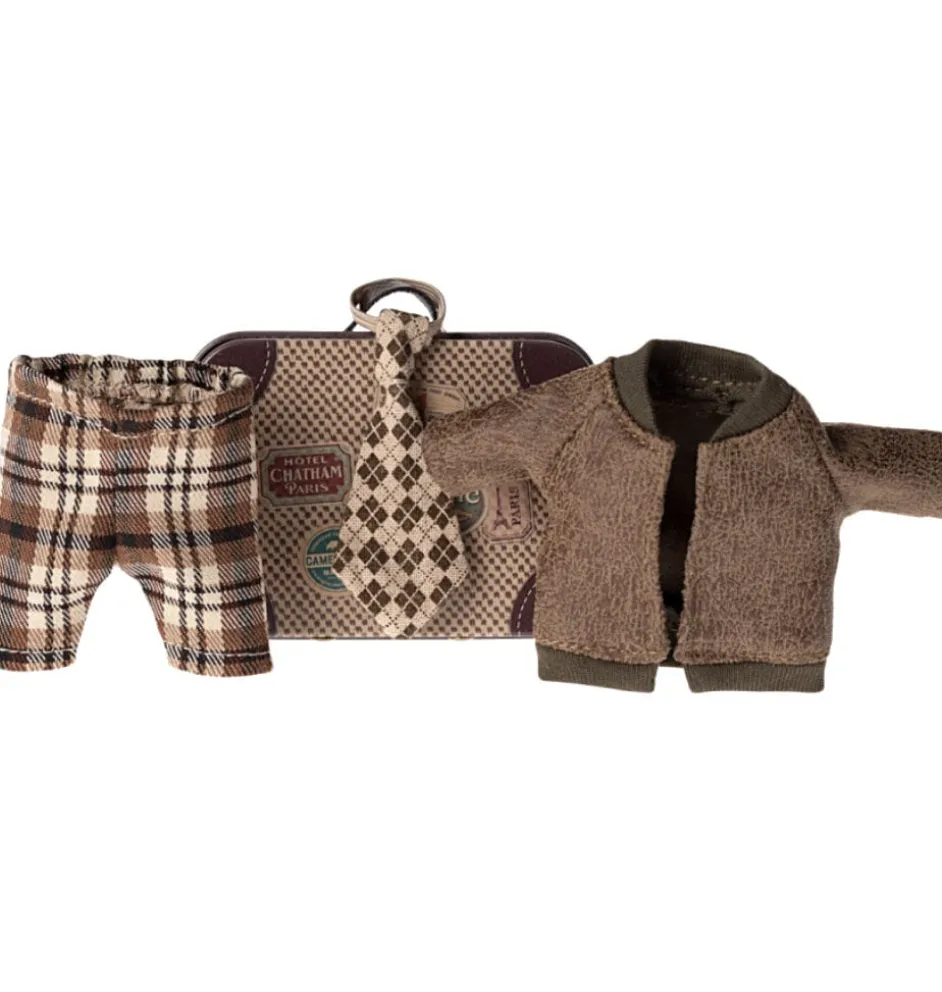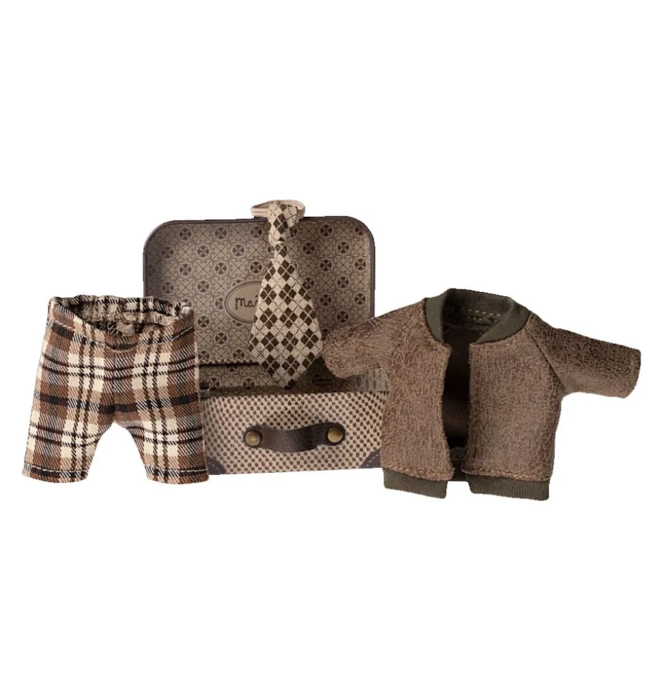 Maileg kledingset grootvader muis met bijpassend koffertje.