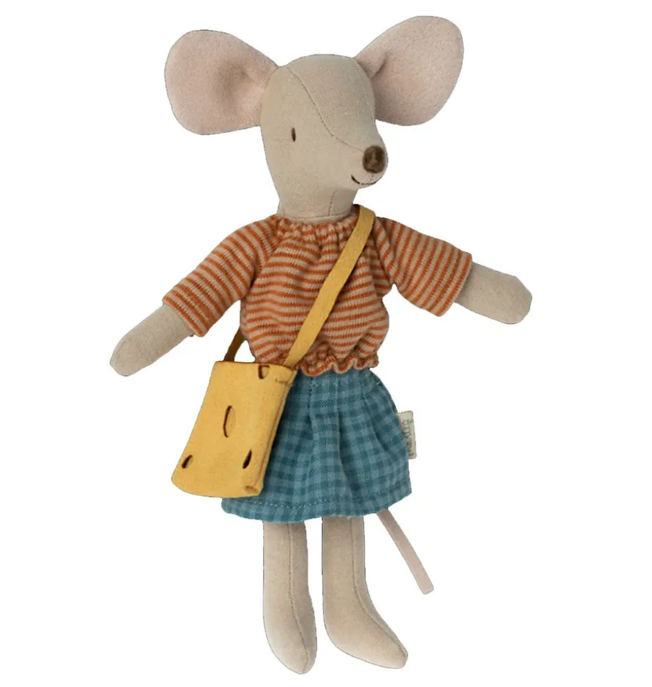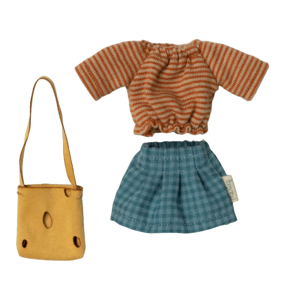 Kledingset met kaastas van Maileg voor moeder muis. De kleding zit in een doosje verpakt.
