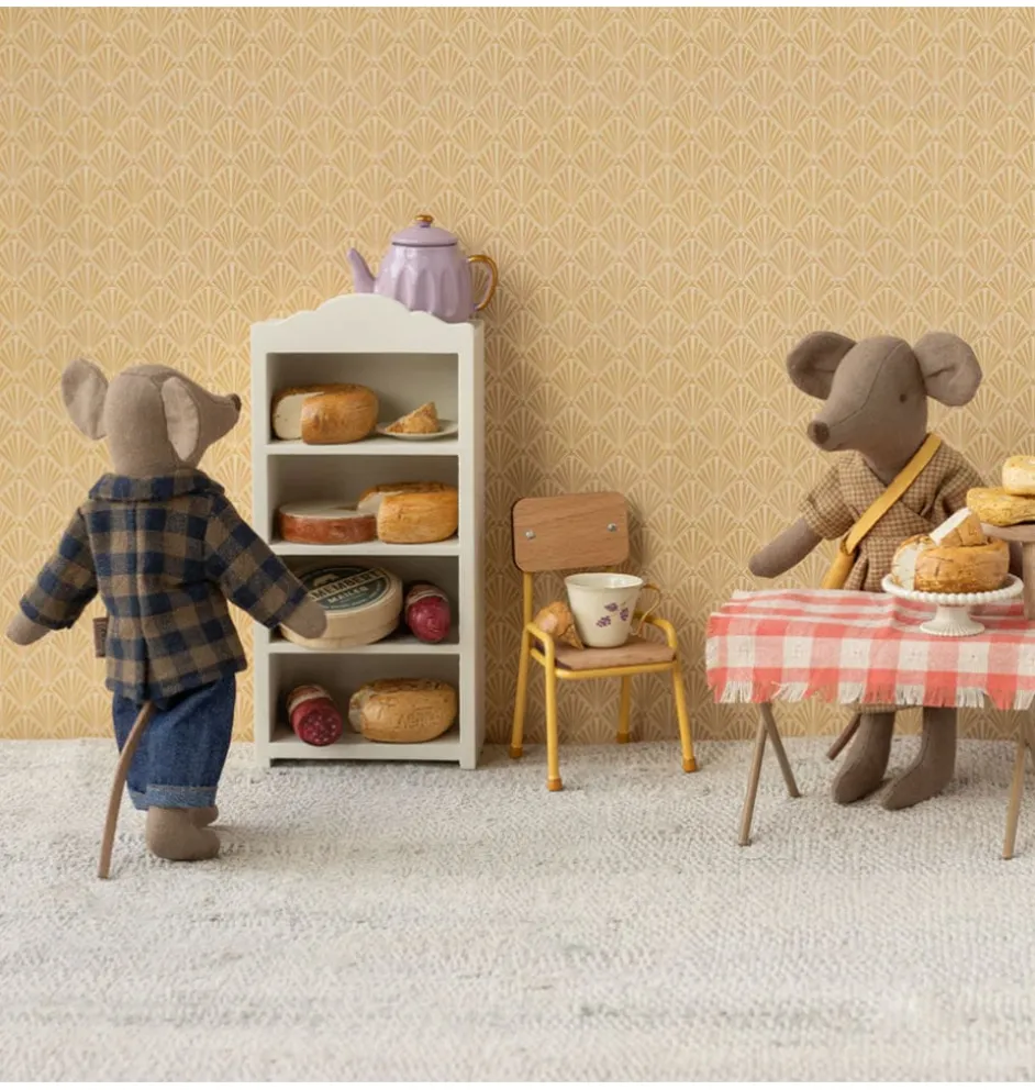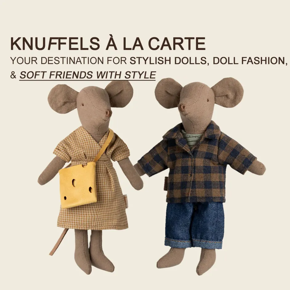 Hippe kledingset voor vader muis van Maileg. De set bestaat uit een stoer geruit overhemd en een spijkerbroek. De kledingset is erg mooi verpakt in een doosje waar ‘Petite Couture’ op staat.