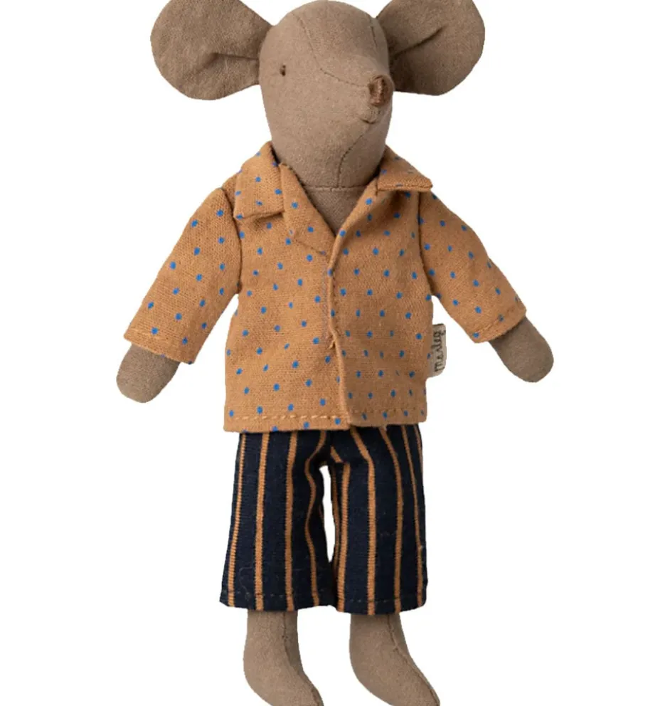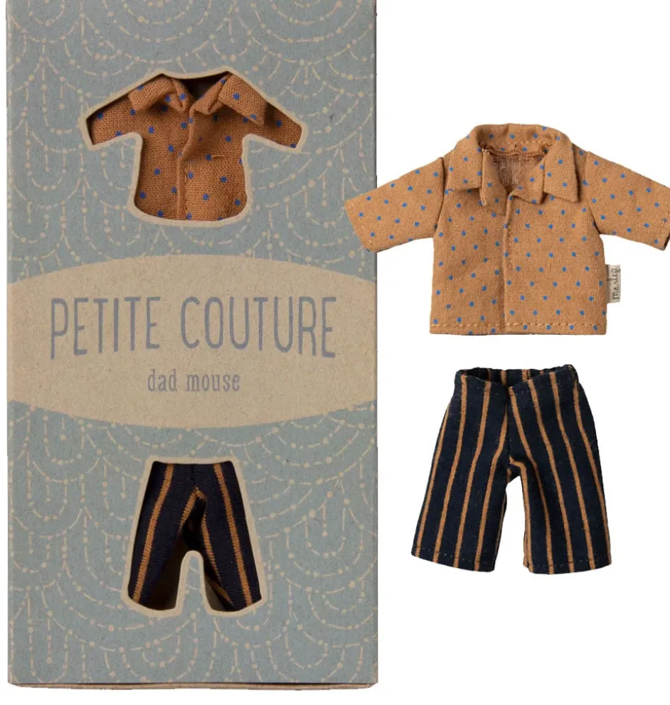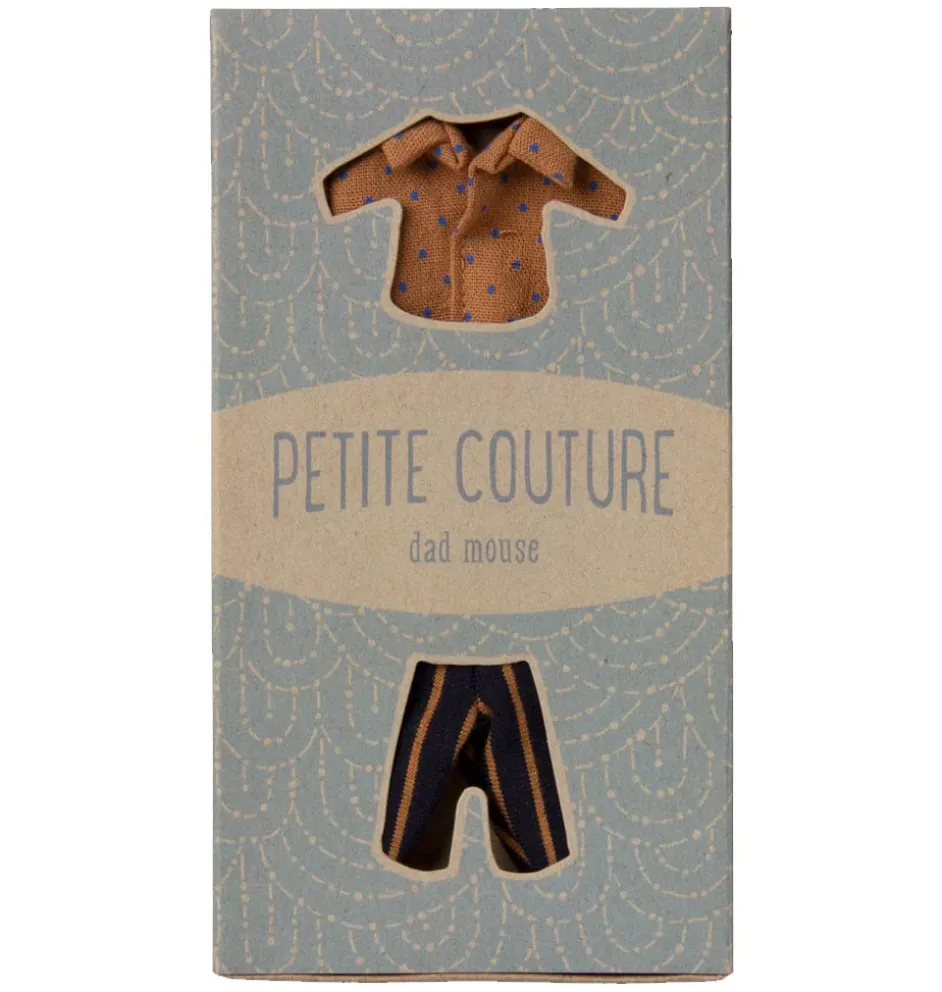 Hippe kledingset voor vader muis van Maileg. De set bestaat uit een overhemd en een gestreepte broek. De kledingset is erg mooi verpakt in een doosje waar ‘Petite Couture’ op staat.