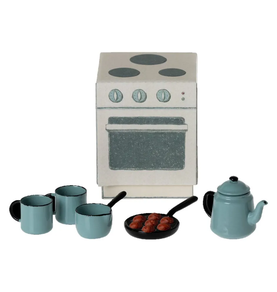 Een miniatuur kookset met alle favorieten van Madam Blue. Een blik en twee kopjes, een steelpan en een pan met heerlijke soesjes, een traditionele Scandinavische lekkernij in de winter. Al deze onderdelen komen in een kartonnen dooje dat eruitziet als een fornuis.