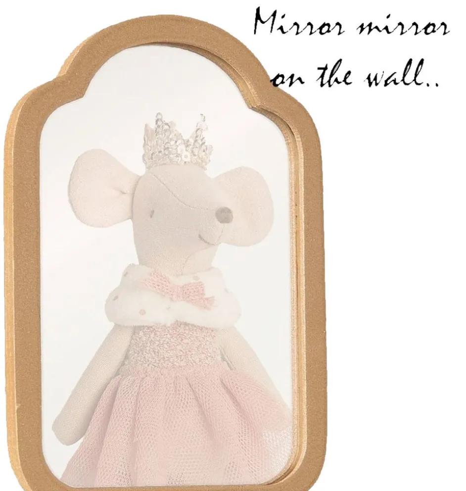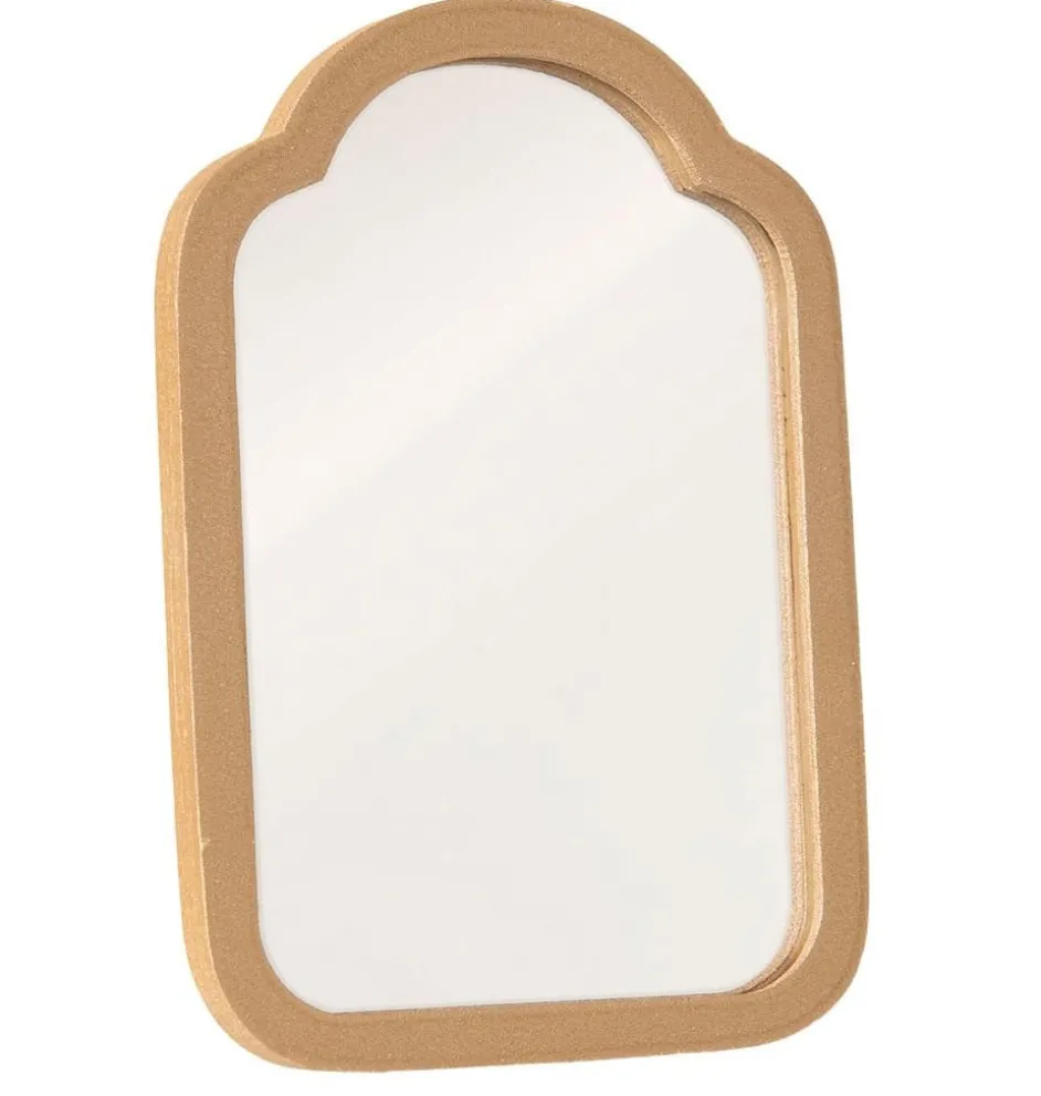 Spiegel van Maileg voor het muizenhuis, of voor het poppenhuis. De spiegel is 7 x 10 cm en de lijst is gemaakt van hout.