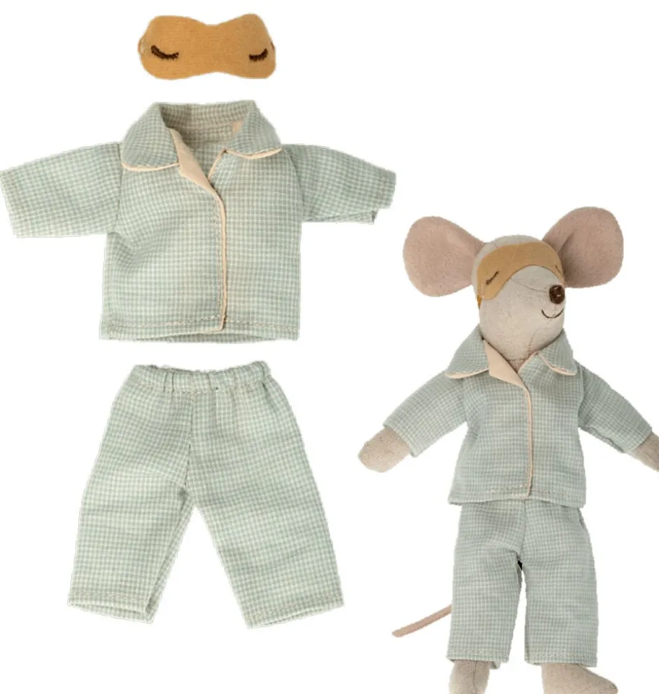 Nachtkledingset van Maileg voor vader muis. Er zit een pyjama en een oogmasker in.
