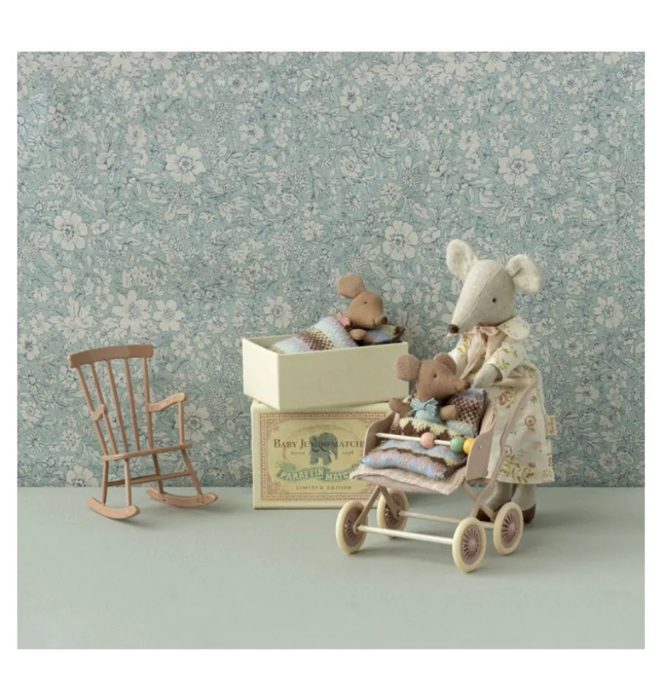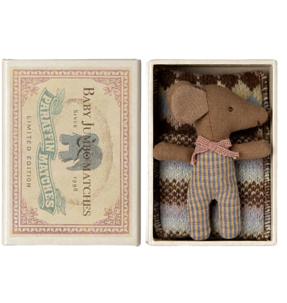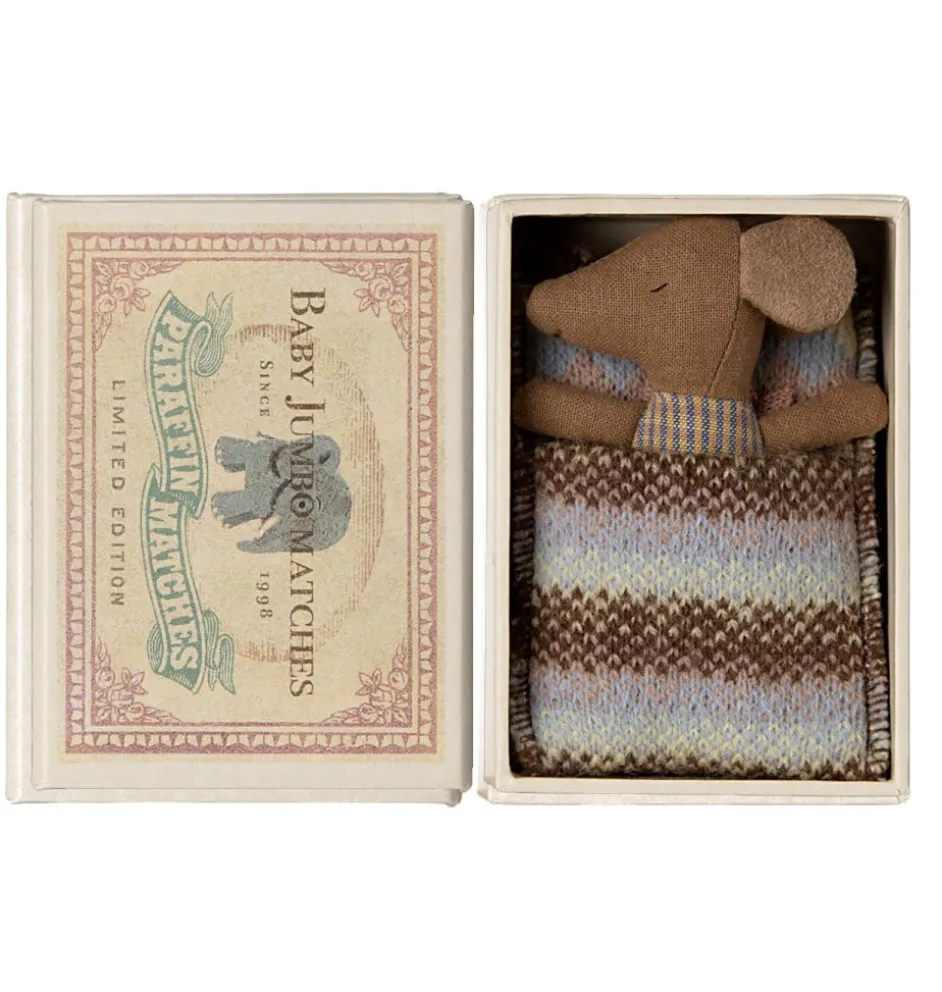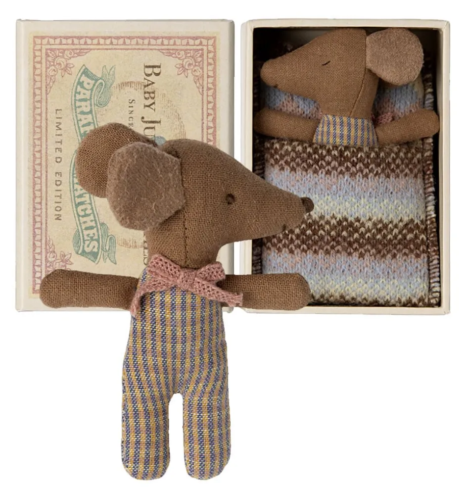 Lief babymuisje van Maileg in doosje. Aan de ene kant heeft zij een slapend oogje aan de andere kant een wakker oogje. Het muisje komt in haar bedje in de vorm van een mooi doosje. Inclusief beddengoed.