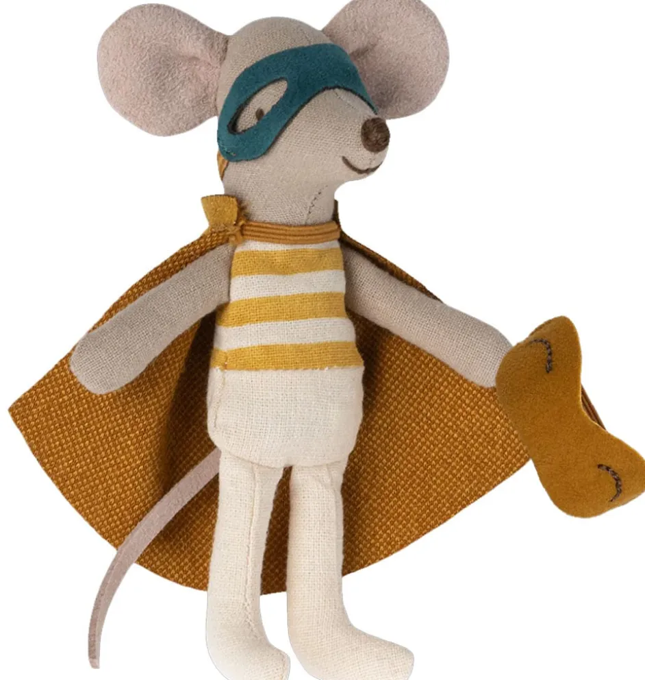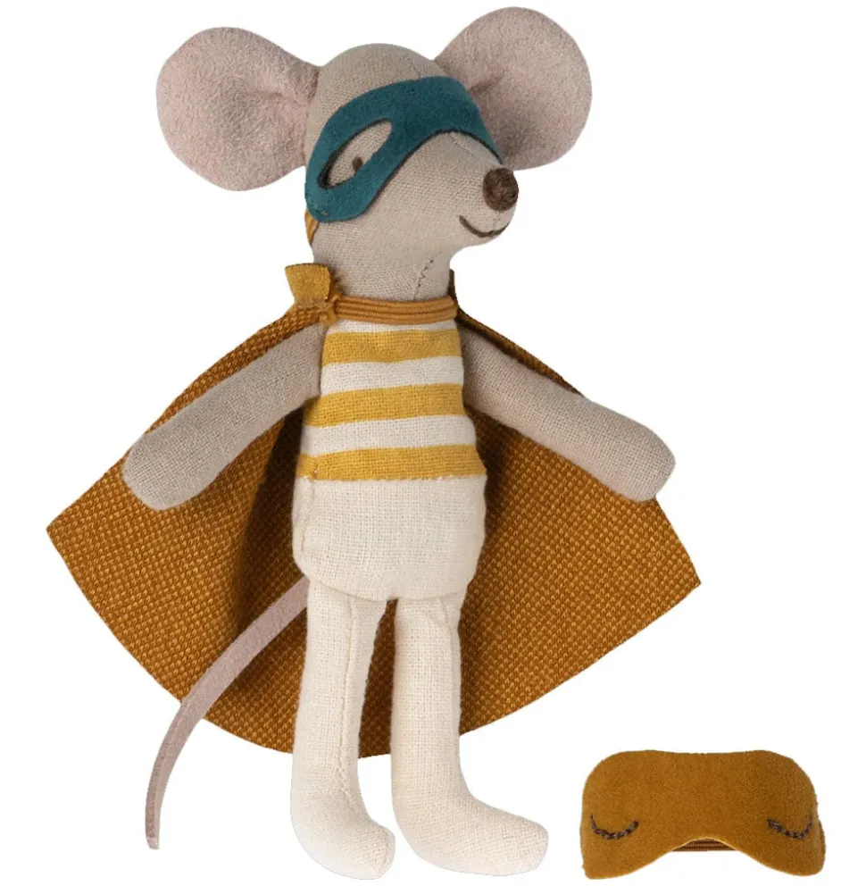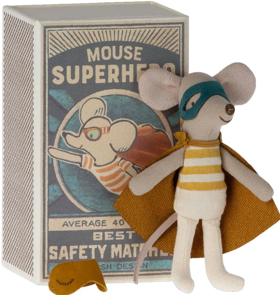 Maileg little brother superheld in luciferdoos. Het muisje heeft ook een slaapmasker en ligt dan graag in zijn luciferdoos met beddengoed.