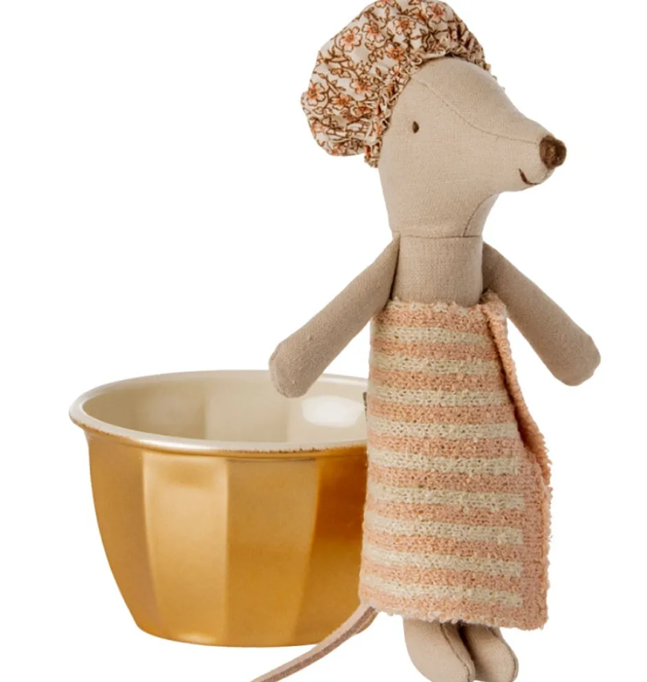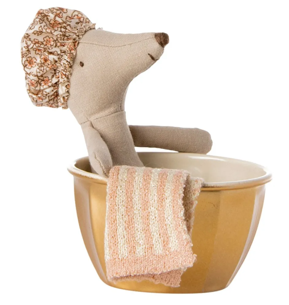 De set bestaat uit een Big Sister muisje, een gouden metalen badkuip, een badmuts en een handdoek.