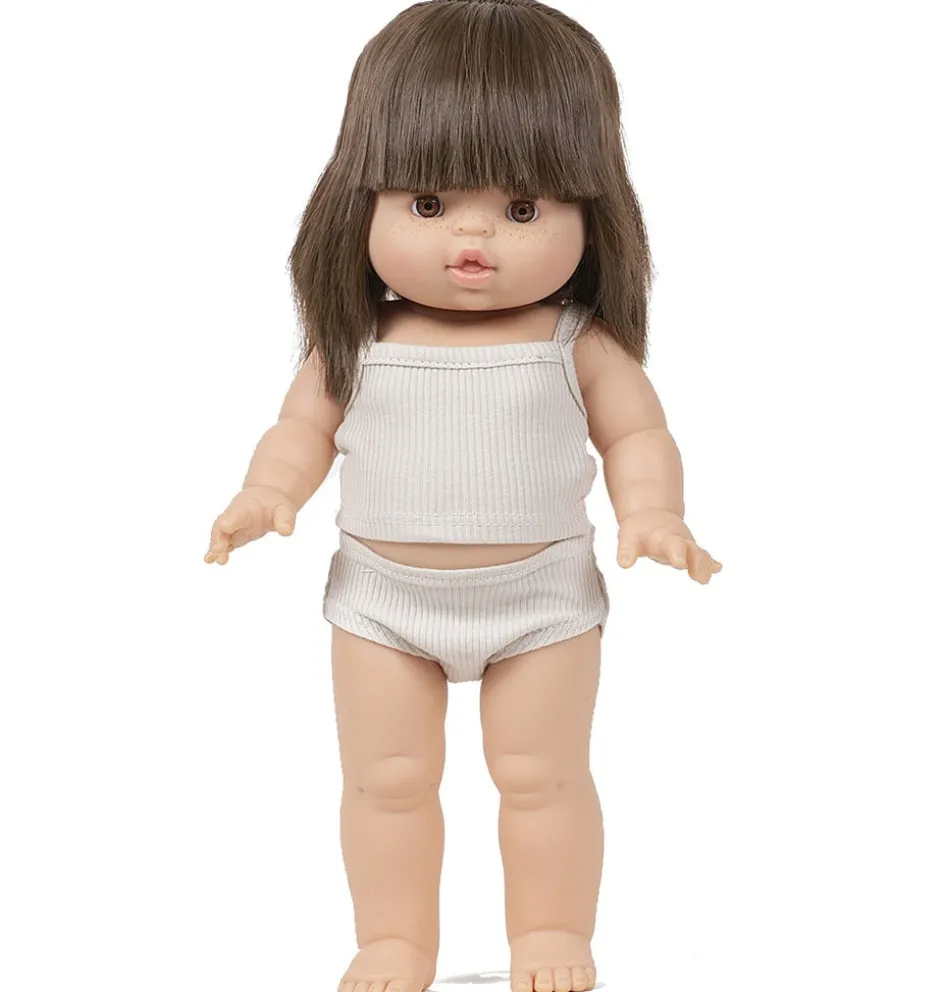 Minikane / Paola Reina pop Janelle37 cm. Deze pop kan rechtop staan, heeft rechte benen en is 37 cm lang. Ze draagt een Minikane ondergoedsetje. De pop kan rechtop blijven staan en is iets groter dan de Gordi poppen. Zij ruikt net als alle Gordi poppen licht naar vanille. De pop is verpakt in een verpakkingsdoos van Minikane.