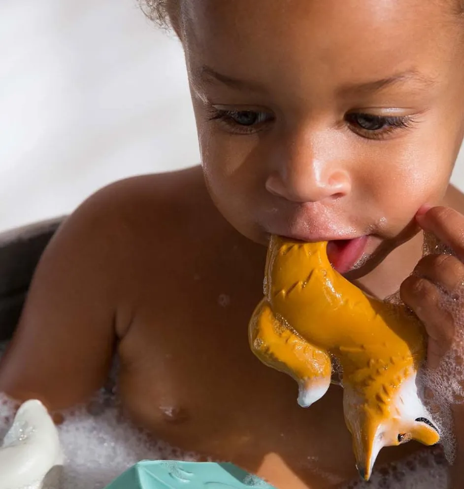 Dit bijtspeeltje, badspeeltje en armband in één is gemaakt van natuurlijk rubber zonder gaatjes, waardoor het bacterie- en schimmelvrij blijft.
