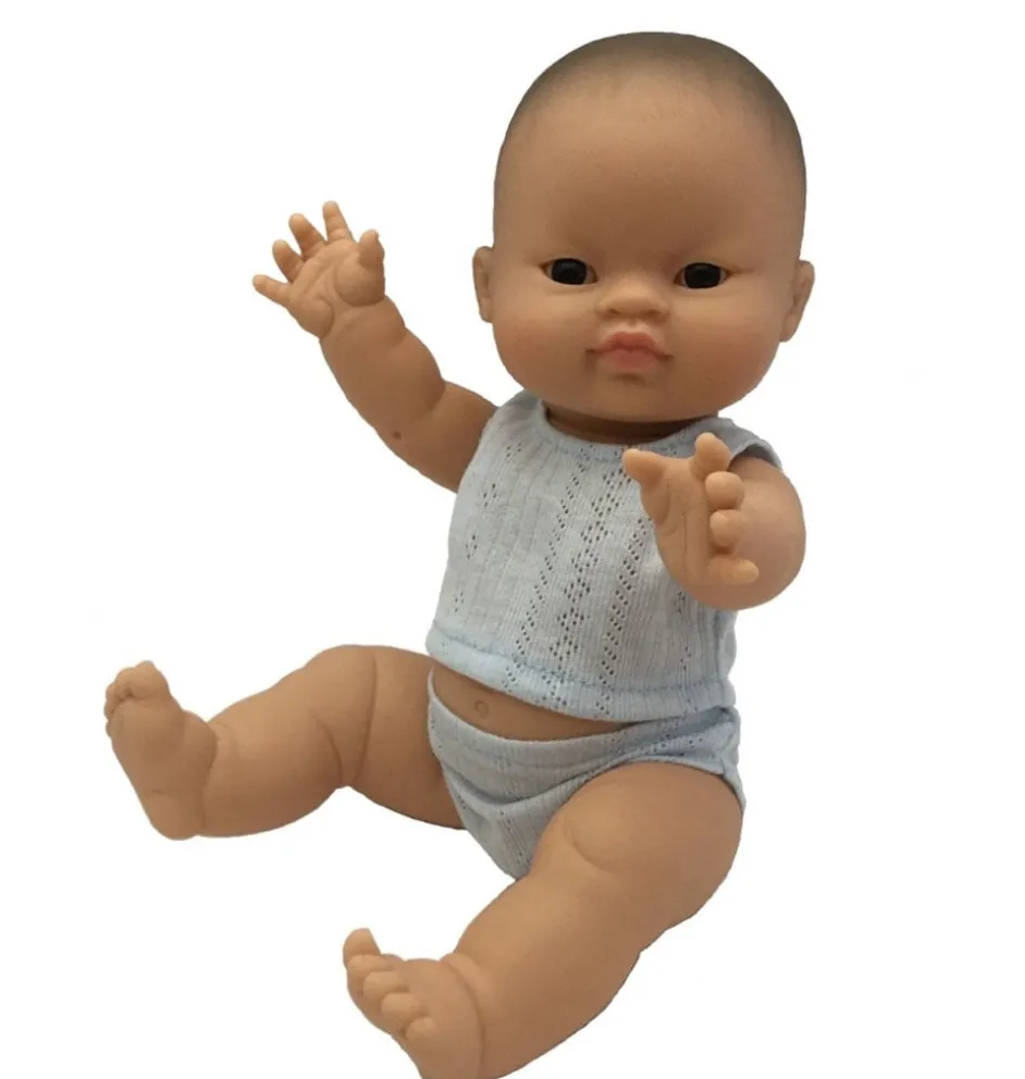 Dit is een Aziatische jongen met donkere ogen en een ondergoedsetje.