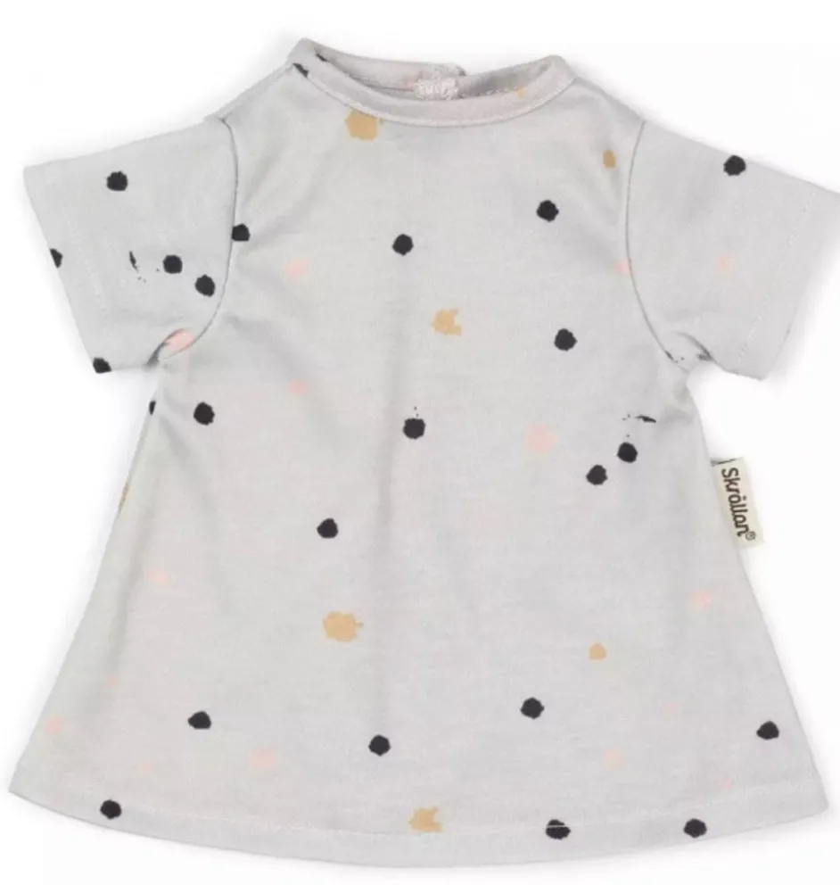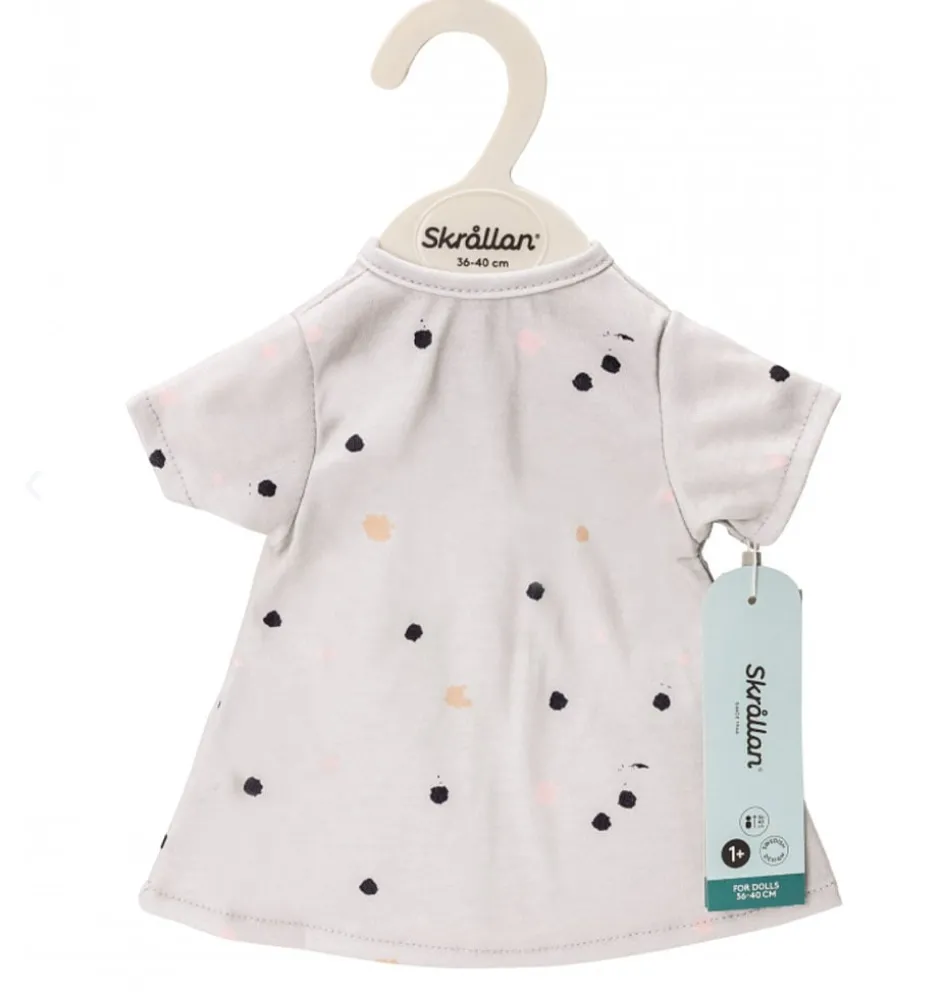 Grijze poppenjurk met stippen van het Zweedse merk Skrållan. Ontworpen voor poppen van 36 tot 40 cm. De Miniland poppen van 38 cm en de staande poppen van Minikane kunnen deze jurk dragen. Bij de Gordi poppen valt de jurk tot de enkels.